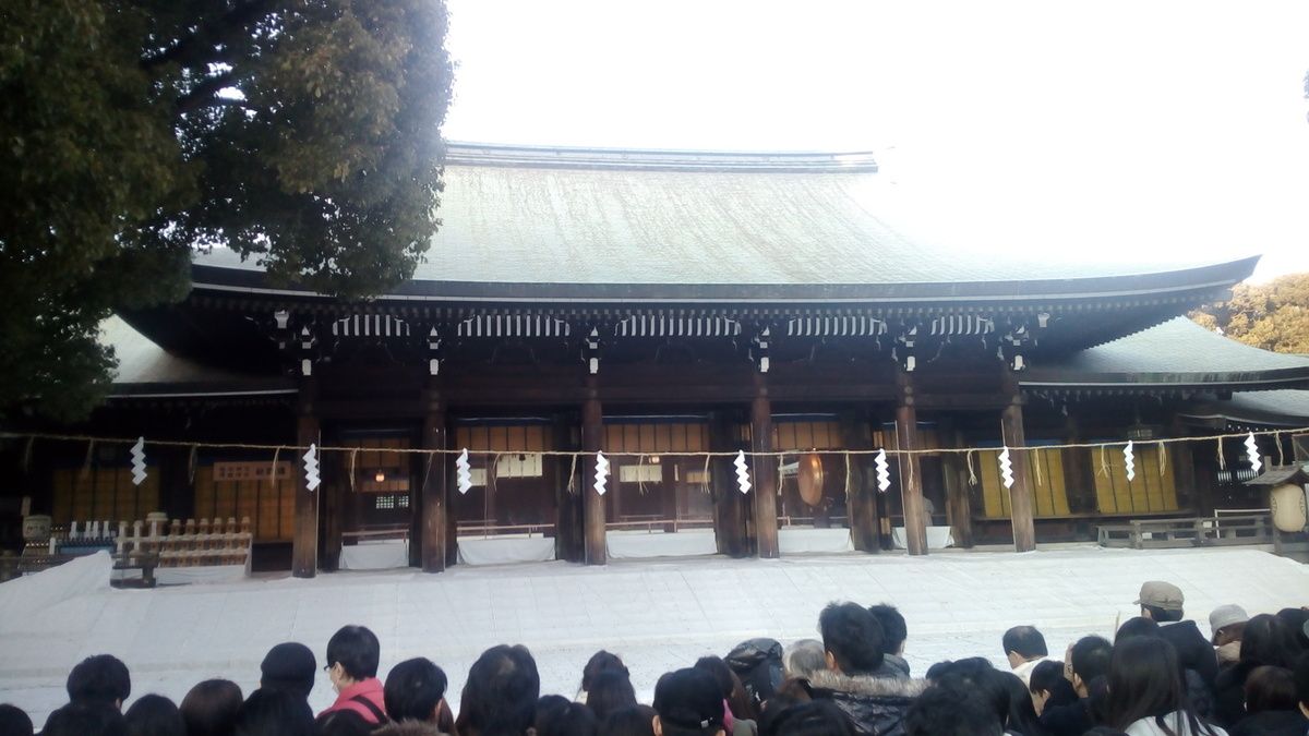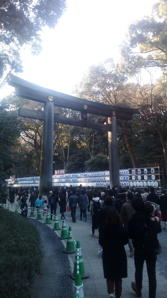 Le festin est digéré alors que nous nous rendons au sanctuaire shintoïste Meiji. Contrairement à son amplitude (le plus grand sanctuaire de tout le Japon), il n'est pas si vieux que ça. Sa construction pour les âmes du couple impérial de début 1900 date du XXe siècle. Sans compter sa destruction sous les bombardements américain, on peut dire qu'il est jeune. Pour changer, la queue est présente à l'entrée du temple. Seul bémol, la queue vaut pour tout le monde (ceux qui veulent mettre la pièce ou ceux qui veulent voir la tronche du bâtiment). Et elle est longue. Très longue. Cependant en 30-40 minutes, on parcourt les 500 m qui nous séparent du Tori principal.