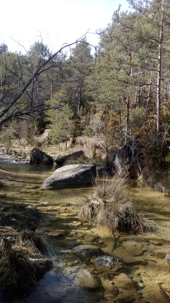 Le chemin de randonnée suit ce filet d'eau et que l'on soit d'un côté ou de l'autre du torrent, jusqu'à ce nous arrivions à Colomer, il n'y a pas de problème d'orientation. C'est d'ailleurs très agréable et je ne peux m'empêcher de m'isoler du groupe pour éviter la causette et fixer mon ouïe sur l'écoulement de l'eau. Avec la luminosité d'hiver, tout parait figé, mais la pureté du ruisseau et son éclat rendent cette paralysie hivernale hors du temps. Il y a le bonus "Vase dorée" qui donne l'impression que le lit de la rivière est fait d'or. Magique, moi, je dis.