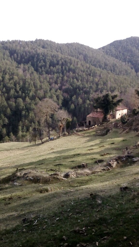 Une fois que nous laissions pour de bon le torrent, nous remontons encore une partie de la montagne afin d'obtenir un panorama sur les lointaines Pyrénées enneigées. Le chemin traversait des prés de brebis, moutons et vaches, ce qui faisait que nous avions un sous-bois vraiment propre à l'herbe rase. Par ailleurs, après ce sous-bois entretenu, nous déboulions sur une grande prairie où une grange isolée me faisait penser à Heidi immédiatement. En revanche, le grand-père qui y vit fut moins amical. Il nous gueula dessus sous prétexte que les moutons eurent peur du chien d'une des randonneuses, mais l'animal n'avait pas broncher ni couru après les bêtes. Les moutons ont été effrayés par l'arrivée d'un groupe de 20 randonneurs, oui (Ils ont des réactions stupides, c'est connu) ! Bref, une altercation un peu contrariante mais pas de mal pour les deux parties.